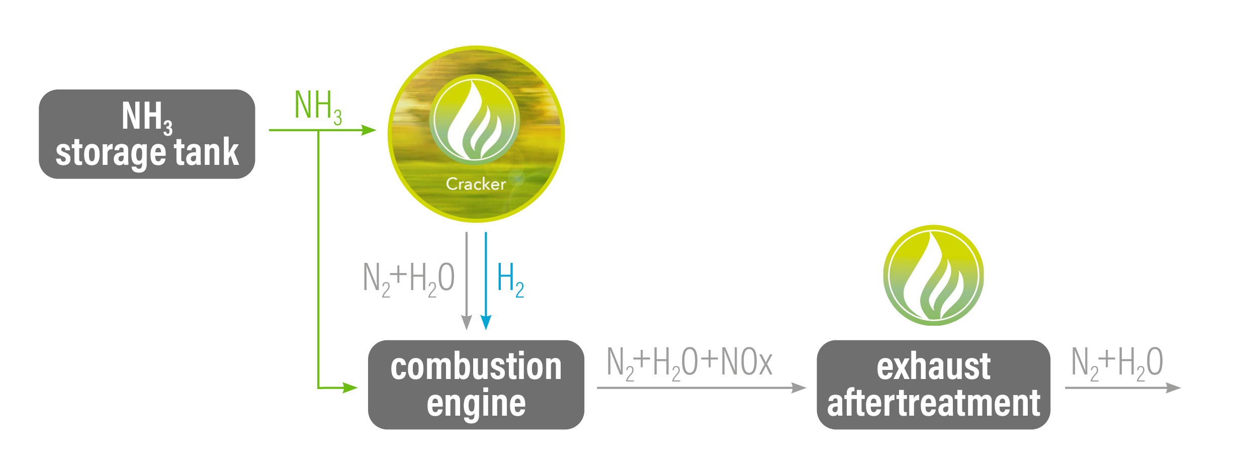 The core component is our patented NH3-cracker. Reversing the ammonia synthesis releases hydrogen immediately prior to combustion. This released hydrogen makes the ammonia-hydrogen mixture combustable.